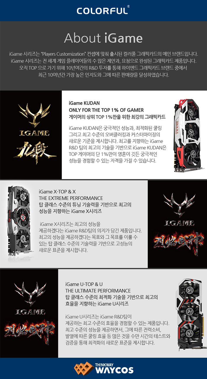 컬러풀 iGame 시리즈는 “Players Customization”이라는 컨셉트에 맞춰 기획된 컬러풀 그래픽카드의 메인 브랜드로, 전 세계 게임 플레이어들의 수 많은 제안과 요구사항을 기반으로 완성된 그래픽카드 제품이다. 컬러풀 테크놀로지사의 오직 “TOP”으로 가기 위한 11년여간의 R&D투자를 기반으로 탄생된 KUDAN 등 전 세계 게이머들을 위한 iGame 그래픽카드를 출시하여 브랜드의 인지도를 쌓아왔다.