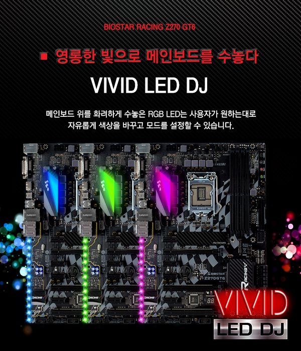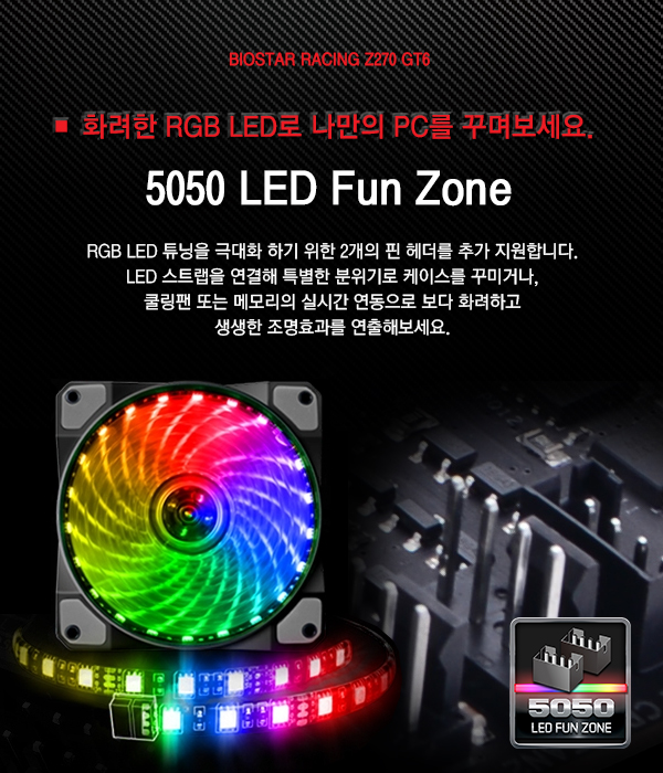 [BIOSTAR RACING Z270 GT6]는 전원부 방열판과 PCI 슬롯을 따라 다수의 RGB LED를 적용하는 한편, RGB LED 팬 또는 LED 스트랩 사용을 위한 2개의 5050 LED 핀 헤더를 적용해 동급 최고 수준의 RGB LED 사용환경을 제공한다.
