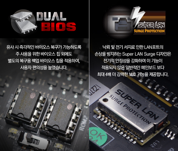 이 밖에도, 습기에 의한 PCB 손상을 막는 고밀도 방습 PCB와 바이오스 손상 시 손쉬운 복구가 가능한 듀얼 바이오스, 서지(Surge)와 ESD, 과전류, 과전압, 과열로부터 메인보드를 보호하는 꼼꼼한 보호 설계를 포함한 탄탄한 기본기와 함께 멀티 레이어 PCB, 오디오 전용 무극성 캐패시터, 하이엔드 헤드폰을 위한 전용 앰프 등 최상의 오디오 경험을 위한 기능까지 갖추고 있다.
