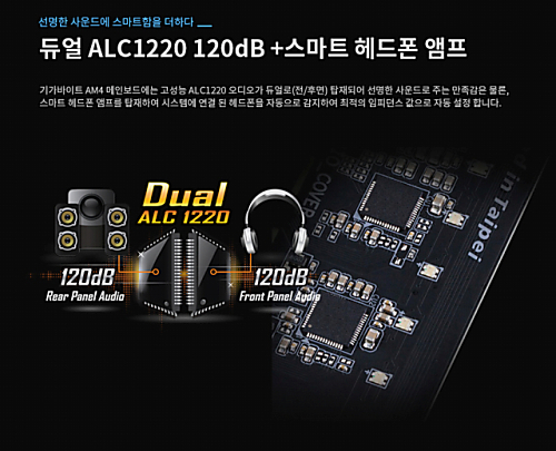 그리고 GA-AX370-Gaming 5는 기가바이트의 어로스 게이밍 메인보드답게 ALC1220 사운드 칩을 전면, 후면에 각각 탑재하여 선명한 사운드로 주는 만족감은 물론, 스마트 헤드폰 엠프를 통해 시스템에 연결된 헤드폰을 자동으로 감지하여 최적의 임피던스 값을 자동으로 설정 한다.