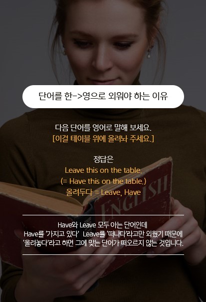 우리가 기존에 배웠던 영어회화 방식은 대개 이렇다. ‘쇼핑할 때는 이런 표현을 많이 쓰니 꼭 외우세요’, ‘자기를 소개하는 글과 단어를 배웁시다’와 같은 문장 위주의 학습이다. 그렇기 때문에 대다수의 경우가 ‘How are you?’, ‘Let me introduce myself’정도의 특정 표현만 기억하고, 실제 영어를 써야 할 순간이 오면 꿀 먹은 벙어리가 되고 만다.