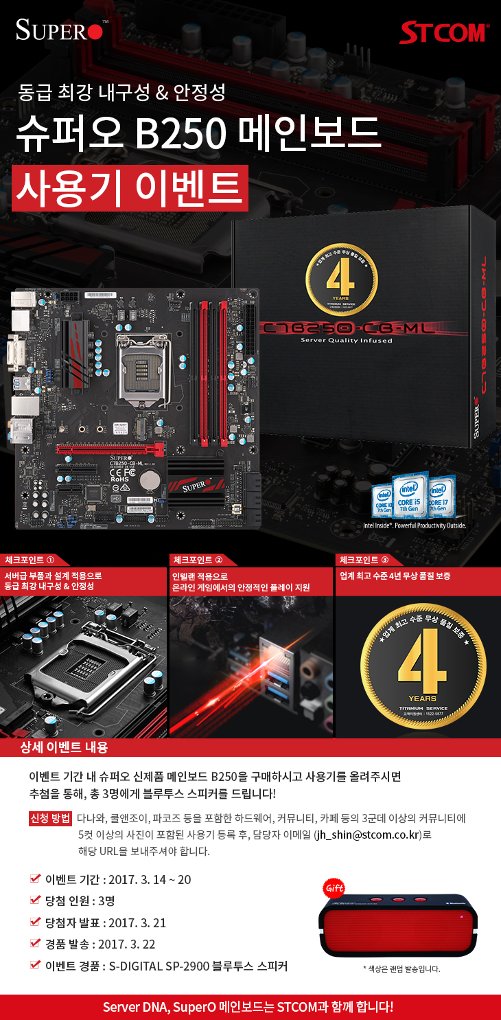 이번 슈퍼오 C7B250-CB-ML 메인보드 사용기 이벤트는 총 4회에 걸쳐 실시될 예정으로 2017년 3월 14일부터 3월 20일까지 1차, 3월 21일부터 3월27일까지 2차, 3월 28일부터 4월 3일까지 3차, 4월 4일부터 4월 10일까지 4차 사용기 이벤트가 진행된다. 이벤트에 응모하기 위해서는 다나와, 쿨엔조이, 파코즈 등을 포함한 하드웨어, 커뮤니티, 카페 등 최소 3군데 이상의 커뮤니티에 5컷 이상의 사진이 포함된 사용기를 등록 후 이벤트 담당자 이메일로 해당 URL을 보내주어야 응모가 완료되며, 이벤트에 응모한 분에 한하여 추첨을 통해 매 회 마다 3분씩 총 12분에게 블루투스 스피커(SP-2900)제품을 증정한다.
