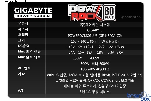 그런 80PLUS 스탠다드 인증을 받은 PoweRock 500W 80PLUS를 3년 무상 1:1 교환이라는 간판을 내걸고 기가바이트에서 출시했다.