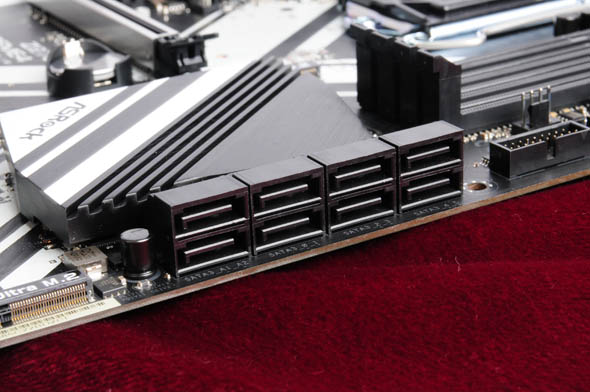 추후 추가적으로 인텔의 옵테인 메모리 기술과 SATA 포트에 관한 기사가 나갈 것이지만, 온보드는 M.2 슬롯을 SATA 모드로 작동을 시키게 되면 최대 3개의 SATA 포트를 사용할 수 없게 된다. 즉 현재의 방식, SATA M.2 연결 방식은 인터럽트를 SATA 것을 공유해서 벌어지는 현상으로 실제 인텔의 Z270 칩셋이 지원하는 네이티브 SATA 포트 6개는 전체를 사용할 수 없다. 그래서 에즈락에서는 추가적으로 외부의 SATA 칩셋을 통해 추가적으로 2개의 SATA 포트를 추가적으로 지원한다. 또한 이 2개의 SATA 포트는 메인보드의 설정으로 RAID 로도 작동을 시킬 수 있다.