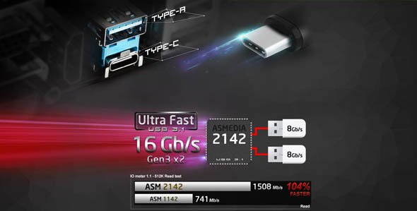 아래 사진 상에서 본다면 USB3.1A 그리고 스마트폰을 위한 USB 3.1C를 지원하는데 현재 삼성, LG, HTC 등의 스마트 폰들이 이를 지원한다. 실제 간단하게 통신만을 위해 USB 3.0 TYPE C 를 사용하는 것에서 모자라 이 포트를 사용하게 되면 빠른 충전을 위한 퀵차지를 지원하기도 한다. 메인보드에서 이 부분의 지원 부분은 조금 더 확인 후에 자세하게 별도의 리뷰를 진행해 드릴 것을 약속드린다.